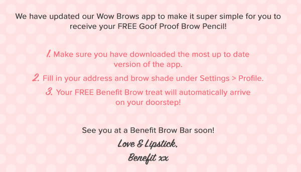 Free Benefit Brow PencilBenefit Cosmetics is giving away free Goof Proof Brow Pencil worth up to £20 (PROOF) when you download their latest WOW Brows app (iPhone or Android) and then fill in your address details and brow shade under Settings > Profile to get your free Benefit Brow treat.